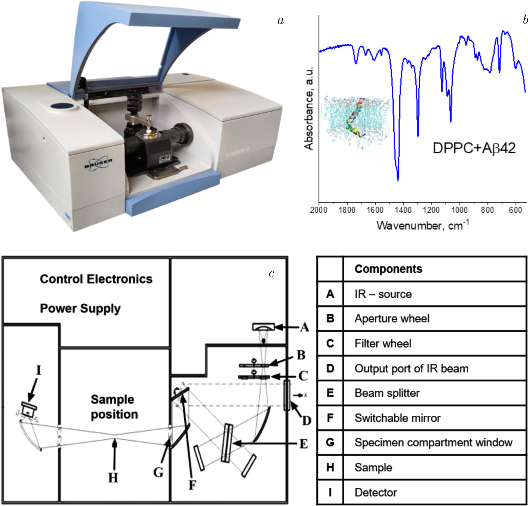 Figure 5. The illustration depicts the application of Fourier-transform infrared (FTIR) spectroscopy in the domain of lipid–protein interaction studies. Panel (\(a\)) shows the FTIR spectrometer setup, a powerful tool for investigating molecular vibrations and providing detailed information about the structural composition of lipid–protein systems. Panel (\(b\)) presents a representative FTIR spectrum of a lipid–protein system, demonstrating characteristic absorbance peaks that correlate with specific molecular vibrations of lipids and proteins, which can be used to assess structural changes and interactions. Panel (\(c\)) depicts the optical layout of the FTIR system, with a description of the beam path and sample configuration, highlighting the precision and sensitivity required to analyze the intricate interactions between lipid and protein components.