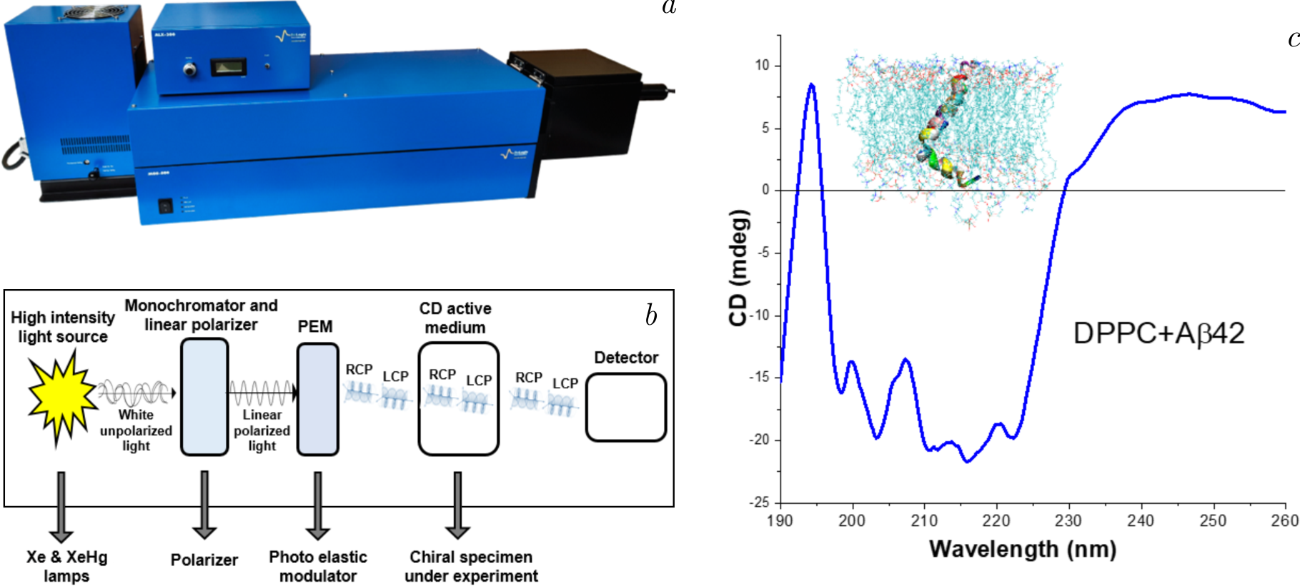 Figure 4. The illustration depicts the integration of circular dichroism spectroscopy into investigations of lipid–protein interactions. Panel (\(a\)) displays the MOS-500 CD spectrometer, an advanced tool designed to detect structural and conformational changes in proteins. Panel (\(b\)) illustrates the optical layout of the instrument, emphasizing the pathway of polarized light through the sample for precise measurements of chirality and secondary structure. Panel (\(c\)) showcases CD spectra of the Aβ42 peptide within a 1,2-dipalmitoyl-sn-glycero-3-phosphocholine (DPPC) lipid bilayer system, highlighting conformational shifts induced by the lipid environment. This figure underscores the utility of CD spectroscopy in elucidating peptide–lipid interactions critical to understanding biomolecular dynamics.