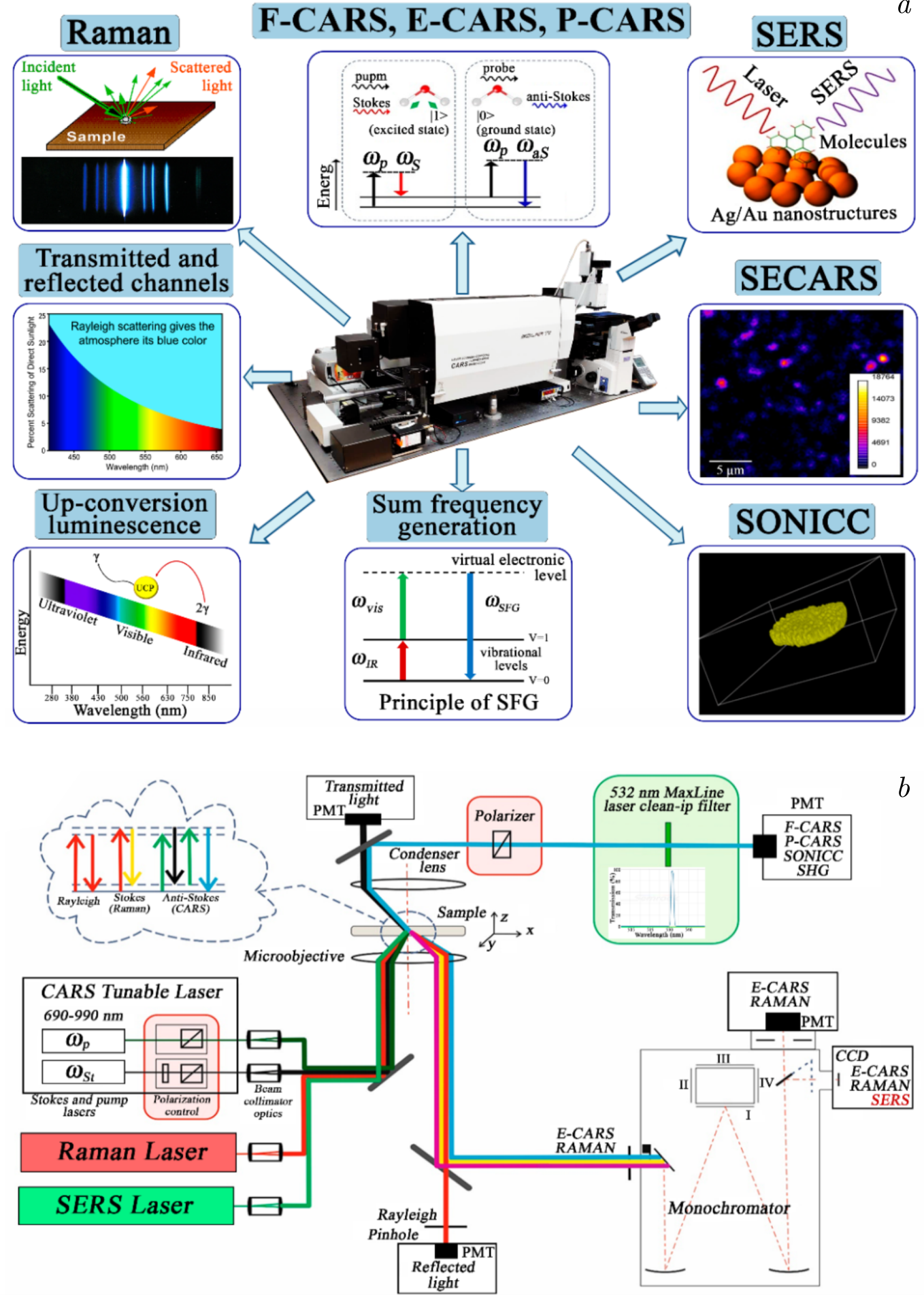 Figure 2. a) Multimodal optical platform based on the Confotec CARS Raman microspectrometer, and b) optical layout used for lipid–protein interaction studies, where spontaneous Raman spectroscopy is employed alongside with CARS (Coherent anti-Stokes Raman spectroscopy) [58] and SERS (Surface-Enhanced Raman Spectroscopy) for enhanced analysis [59].