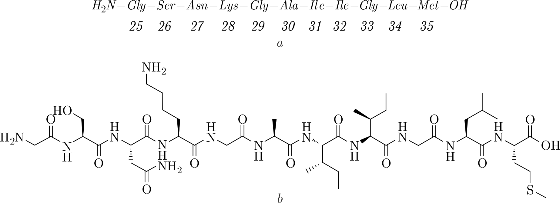 Figure 2. The nucleic acids sequence of the A\(\beta\)(25–35) peptide (\(a\)) and its chemical structure (\(b\)).