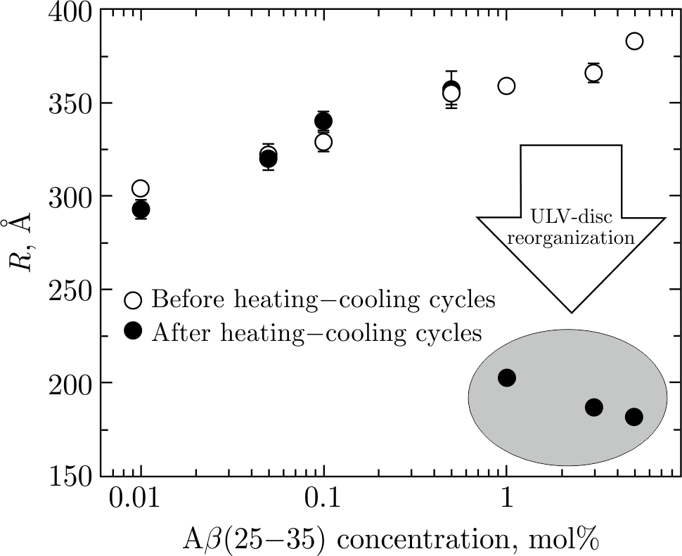 Notwithstanding neuronal toxicity of A\(\beta\) peptides, it is known that A\(\beta\) peptide may participate in important physiological functions. There are studies reviewed in [119] that describe possible roles of A\(\beta\) peptides in protection against some forms of cancer, regulation of activity at hippocampal synapses, and emergence of antimicrobial properties. It is worth noting that the peptides should only be regarded as toxic when their production is excessive, and aggregation is imbalanced. While normal A\(\beta\)-peptide concentration range lies in picomolar and nanomolar intervals[120,121], elevated peptide concentrations were reported to cause, for example, a rapid A\(\beta\)-peptide aggregation into cross-\(\beta\) sheets, which strongly disturb the lipid bilayer [77]. Therefore, the effect of higher A\(\beta\)-peptide concentrations on the morphological reorganizations from ULVs into discs and SUVs has also been scrutinized [87]. The effect has been studied in the extended concentration range of the micromolar (relative to water) interval. Interestingly, but not unexpectedly, morphological reorganizations were observed only above a specific concentration of A\(\beta\)(25–35) molecules (\(\geqslant\!1\) mol%) incorporated into the lipid membranes [87]. Namely, the ULVs containing various concentrations of A\(\beta\)(25–35) peptides incorporated in DPPC membrane were subjected to heating–cooling cycles in order to launch the chain of A\(\beta\)(25–35)-driven morphological reorganization. Comparing the values of radius\(R\) of initial ULVs (Figure 3, empty symbols) obtained by SAXS measurements with those of the final-state samples (ULVs or discs) after heating–cooling cycles (Figure 4, full dots), one may notice a critical peptide concentration, above which morphological reorganization is observed. This effect may be well related to the recognized AD pathogenesis that resulted from an excessive accumulation of A\(\beta\) peptides in brain tissues of AD patients. Further, the importance of