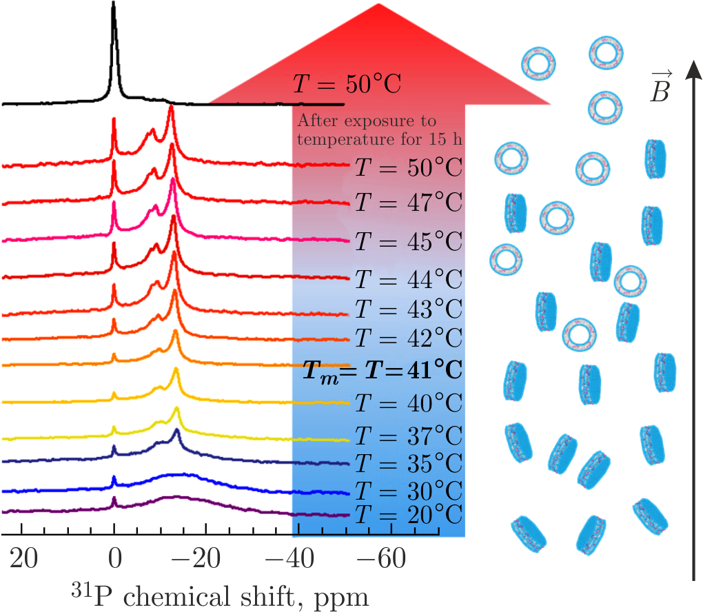 Figure 5. The \(^{31}\)P NMR spectra of DPPC\(+\)A\(\beta\)(25–35) systems recorded upon gradual heating through \(T_{m}\) of DPPC lipids with subsequent sample equilibration at \(T = 50^{\circ}\)C for 15 h in NMR spectrometer. The isotropic phase at 0 ppm corresponds to SUVs undergoing fast isotropic motions, whereas the anisotropic phase at non-zero resonances is associated with magnetically aligned discs. Adapted from [128].