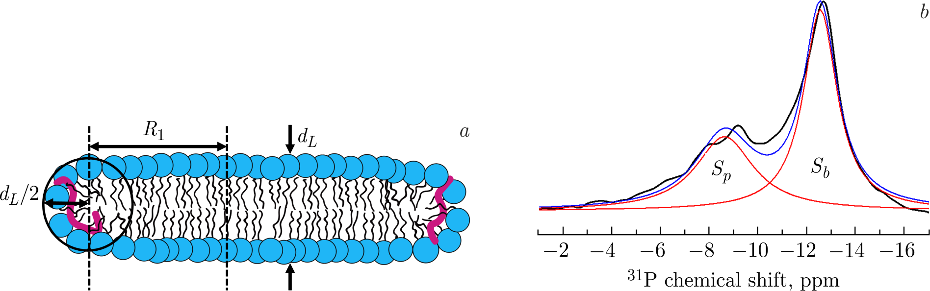Based on the presented \(^{31}\)P NMR spectra, it is possible to obtain structural parameters of the BLSs, their characteristic sizes in particular. The integral value of intensities of the \(^{31}\)P resonances corresponding to anisotropic phase of the sample reflects the ratio of the number of lipids situated in the bilayered part of BLSs (\(N_{b}\)) to that in the perimeter of BLSs (\(N_{p}\)). Given the ratio of peak intensities, it is possible to calculate the disk diameter. \(N_{b}\) and \(N_{p}\) are proportional to the surface area of the BLS and the area of the edges, respectively. While the surface area of BLS's flat part (\(S_{b}\)) represents two lipid monolayers: \(S_{b}=N_{b}A_{L}=2\pi R_{1}^{2}\), the surface area of BLS's perimeter (\(S_{p}\)) can be approximately estimated as the surface area of half-torus: \(S_{p}=N_{p}A_{L}=2\pi R_{1}\displaystyle\frac{\pi d_{L}}{2} = \pi^{2}R_{1}d_{L}\), where \(d_{L}\) is the thickness of the DPPC lipid bilayer, \(R=R_{1} + \displaystyle\frac{d_{L}}{2}\) is the radius of BLS including lipids located on a half-torus, \(A_{L}\) is the area per lipid (see Figure 6a for the sketch). Assuming that the DPPC lipids on the BLS surface and the BLS edges have the same average \(A_{L}\), the BLS's diameter (\(D = 2R\)) is \(D = \displaystyle\frac{S_{b}}{S_{p}}\pi d_{L}+d_{L}\). The \(S_{b}/S_{p}\) ratio reflects the relative areas under the peaks in the \(^{31}\)P NMR spectra evaluated by fitting (Figure 6b). Thus, considering the characteristic bilayer thickness \(d_{L} \approx50\) Å of the gel phase DPPC membrane [83], the calculated diameter \(D\) of BLS is \(\approx\!400\) Å. This result is in an excellent agreement with SANS and SAXS data [84].