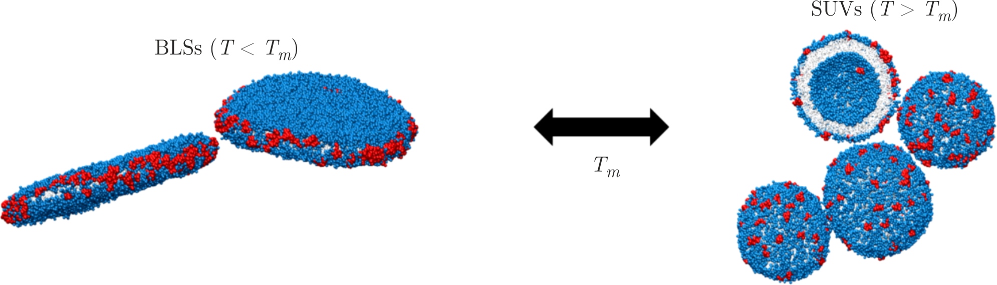 The NMR data may be successfully complemented by the results of CG MD simulations to obtain directly the A\(\beta\)(25–35) peptide distribution in membranes. In recent years, CG models have been able to provide approaches that allow a significant increase in the timescale of simulations [138]. Due to the grouping of individual neighboring atoms into larger units, it is possible to effectively model proteins and large lipid objects on the timescales hardly available to full-atom simulations[139]. First, it was shown by means of CG MD that the randomly distributed lipids, A\(\beta\)(25–35) peptides, and water molecules have self-assembled spontaneously into BLSs below \(T_{m}\) and SUVs above \(T_{m}\) after microsecond timescale simulations (Figure 7) [128]. The size of BLSs and SUVs was in a good agreement with that calculated from the SANS, SAXS, and NMR experiments. Second, the round edge of the BLSs was revealed to contain not only the lipid molecules but also the A\(\beta\)(25–35) peptides, which were situated at the perimeter of BLSs predominantly. The peptide–lipid co-localization at the edge of BLS allows this peculiar shape to be maintained in the aqueous environment. Thus, one of the possible disruptive mechanisms of the A\(\beta\)(25–35) peptide may be based on the ability of A\(\beta\)(25–35) to rearrange the lipid molecules around itself, creating locally a highly curved lipid bilayer.