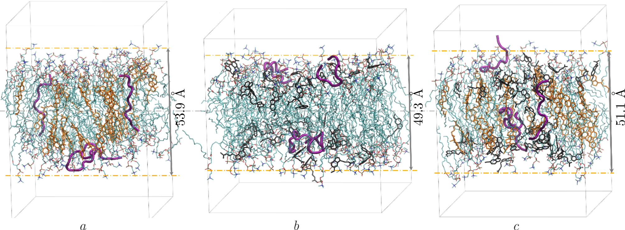 Figure 8. The snapshots of 100 ns MD simulations depicting the patch of DOPC lipid bilayer with initially incorporated A\(\beta\)(25–35) molecules (3 mol%) and loaded with \(a\)) cholesterol, \(b\)) melatonin, \(c\)) cholesterol and melatonin. Concentration of cholesterol and melatonin equals 29 mol%. Cholesterol molecules are shown in yellow, melatonin molecules in black, A\(\beta\)(25–35) peptides in pink, while lipids are represented in cyan. The numbers describe the lipid membrane thicknesses extracted from MD simulations in accordance with [162].