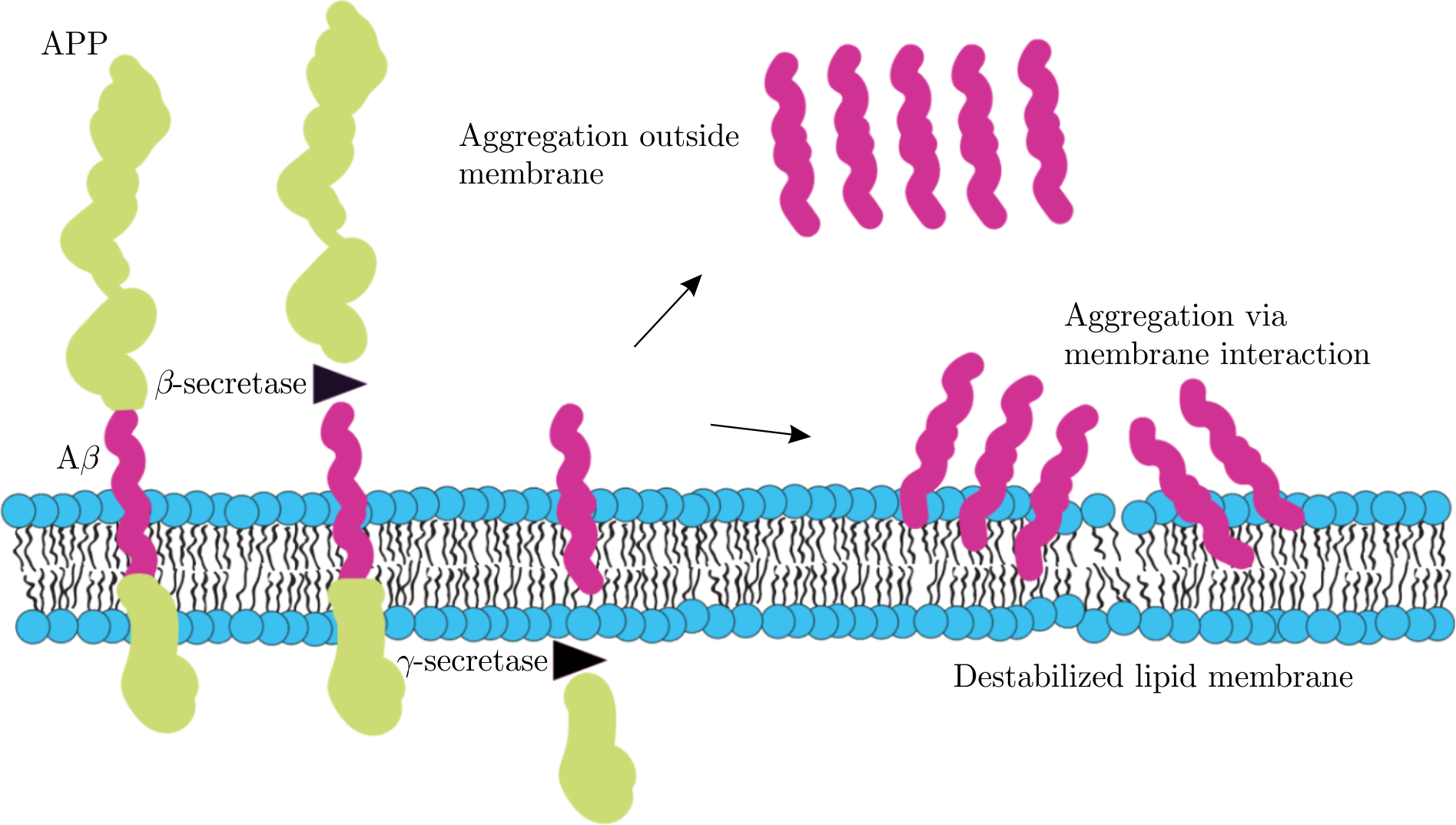 Figure 1. The sketch representing amyloidogenic cleavage of amyloid precursor protein (APP) into A\(\beta\) peptide by enzymes of \(\beta\)- and \(\gamma\)-secretase. The monomers of resulting A\(\beta\) peptides may be involved either in their aggregation in extracellular environment or in membrane destabilization upon their interactions directly with lipid membrane. Both ways lead to peptide cytotoxicity. Graphics is adapted from [18,19].