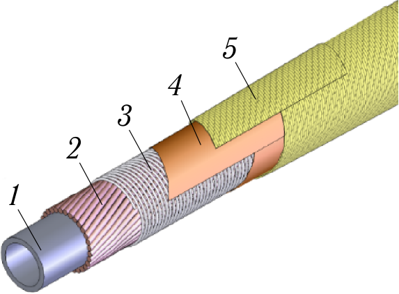 Figure 1. Nuclotron-type cable: 1 — cooling tube; 2 — superconducting wire; 3 — Ni–Cr bandage wire; 4 — polyimide tape (Kapton); 5 — glass tape impregnated with hot-curing epoxy compound.