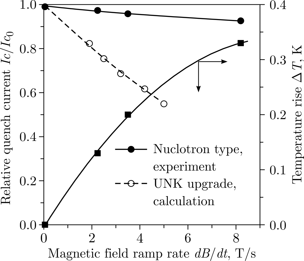The Nb–Ti alloy SC wires are spirally wound on a cooling tube made of cupronickel. To ensure good thermal contact, the SC wires are pressed to the cooling tube using a Ni–Cr alloy bandage wire. The cable has electrical insulation made of two layers of polyimide and two layers of glass tape impregnated with epoxy compound. The use of such a cable in accelerator magnets allows one to (1) abandon the helium vessel of the cryostat, (2) reduce the amount of helium in the magnet and, consequently, increase safety in case of helium eruption due to quench, (3) simplify access to the magnet in the cryostat and the beam chamber, and (4) operate with high rate of the magnetic field change. 2 shows the dependences of the critical current change on the magnetic field rate for the Rutherford-type and Nuclotron-type cables.