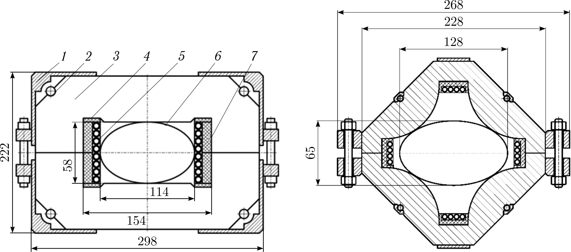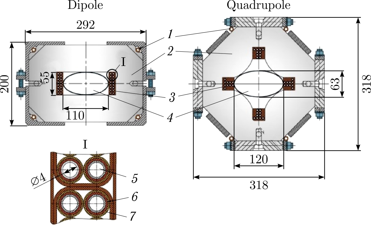 Figure 24. Cross-section of the dipole magnet (left) and quadrupoles (right) of the New Nuclotron with combined cooling: 1 — corner; 2 — yoke cooling tube; 3 — yoke; 4 — end spacer; 5 — winding; 6 — beam chamber; 7 — side spacer.