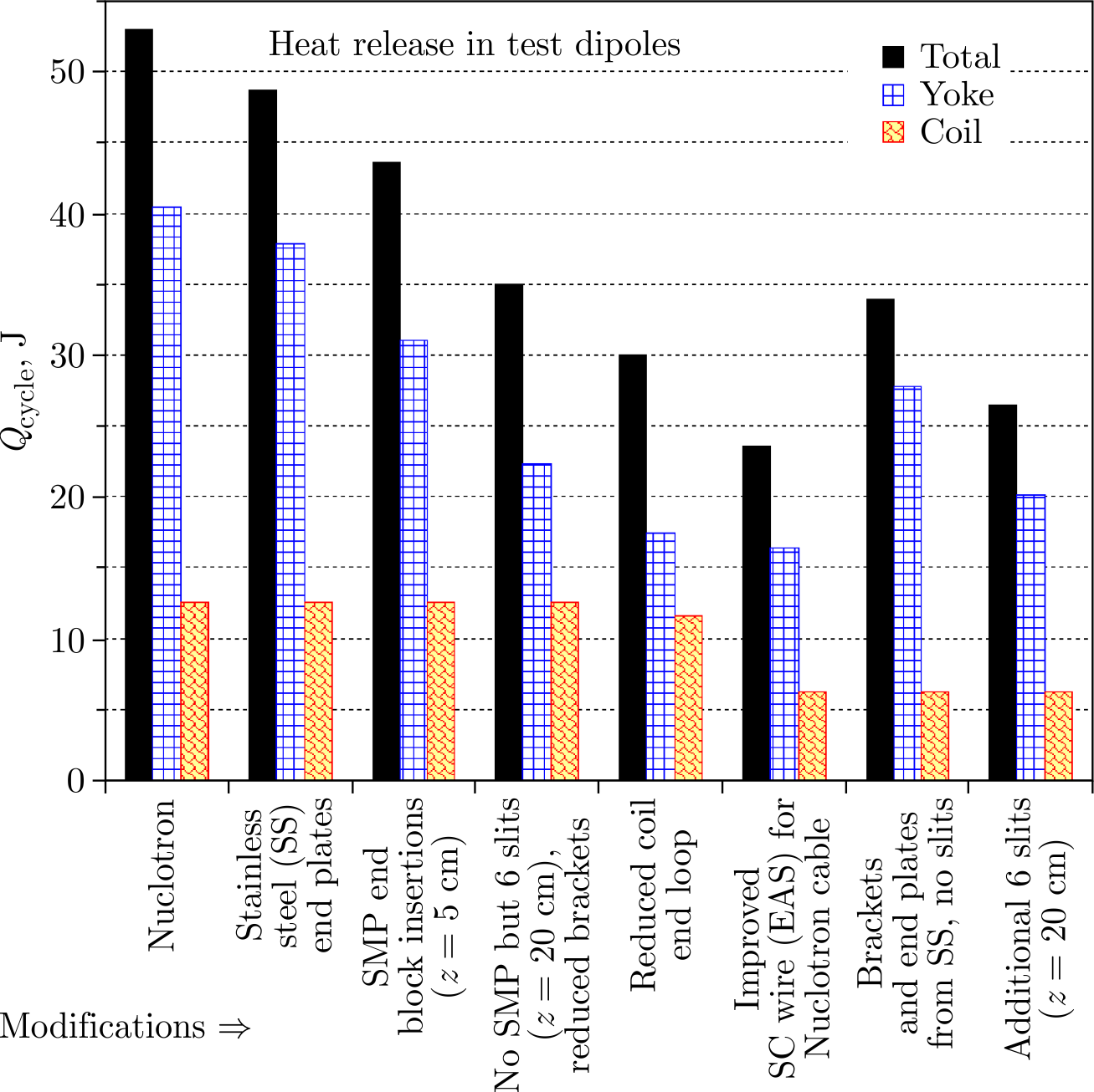 The second stage of development of SC accelerator magnets at JINR began in 1999 in connection with the request of GSI, Darmstadt, to JINR to participate in the joint development of the SC magnets of the Nuclotron-type for the SIS100 accelerator of the FAIR project [7]. The R&D was completed in 2012 with the launch of serial production of SIS100 magnets [8]. At this stage, the Nuclotron magnet was modernized. Energy losses during operation in a cycle were reduced; the homogeneity of the magnetic field in the aperture was improved; the mechanical and electrical strength of the winding were increased; a single-layer winding and a curved magnet were introduced [9]. Figure 4 shows a comparison of experimental data on the heat generation in the Nuclotron magnet and the SIS100 prototype magnets with various modifications.