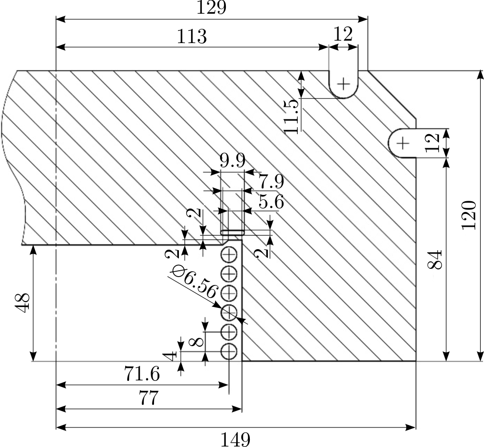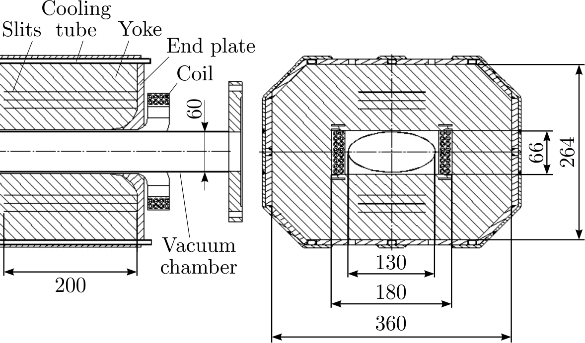 The compact coil design has 12 turns and, consequently, each pole has 6 turns. A slot located above the coil groove is used for improving the field homogeneity. The magnetic field in the center reaches 1.8 T at the operating current of 11\,750 A. Figure 17 illustrates the cross-section of the dipole magnet. The dimension of the iron yoke is \(298\times 240\) mm. The distance between centers of two adjacent cable turns is about 8.0 mm.