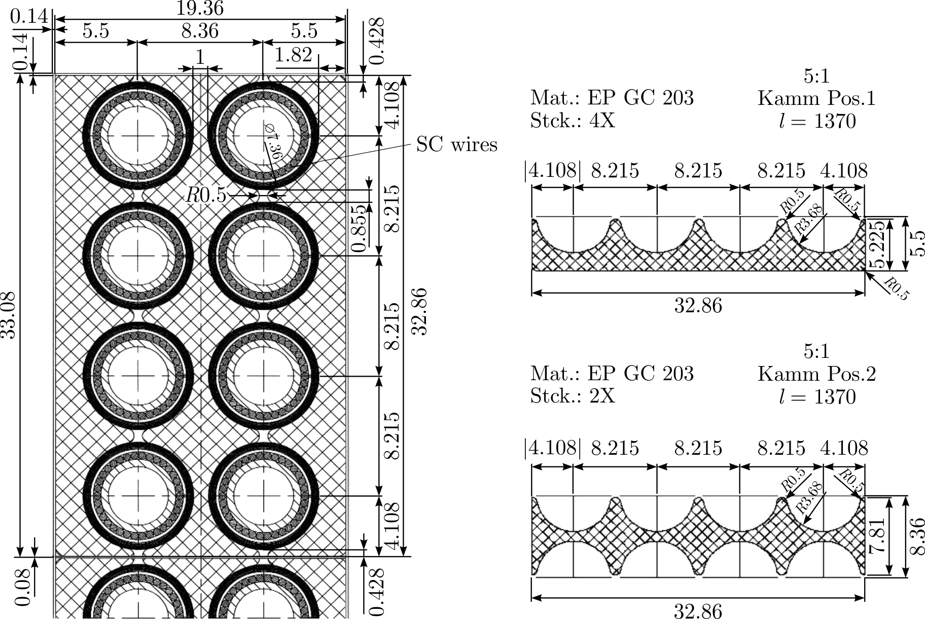 In addition, alternative technologies were developed to enhance the geometrical precision of the cable positioning and the mechanical stability of the coil adding the textured fiberglass (G11) structures into the coil design (see Figure 7) [15].
