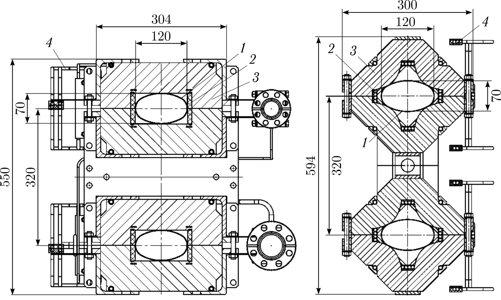 Figure 10. Cross-section view of the dipole (left) and quadrupole (right) for the NICA collider: 1 — beam pipe; 2 — SC coil; 3 — iron yoke; 4 — bus-bars.