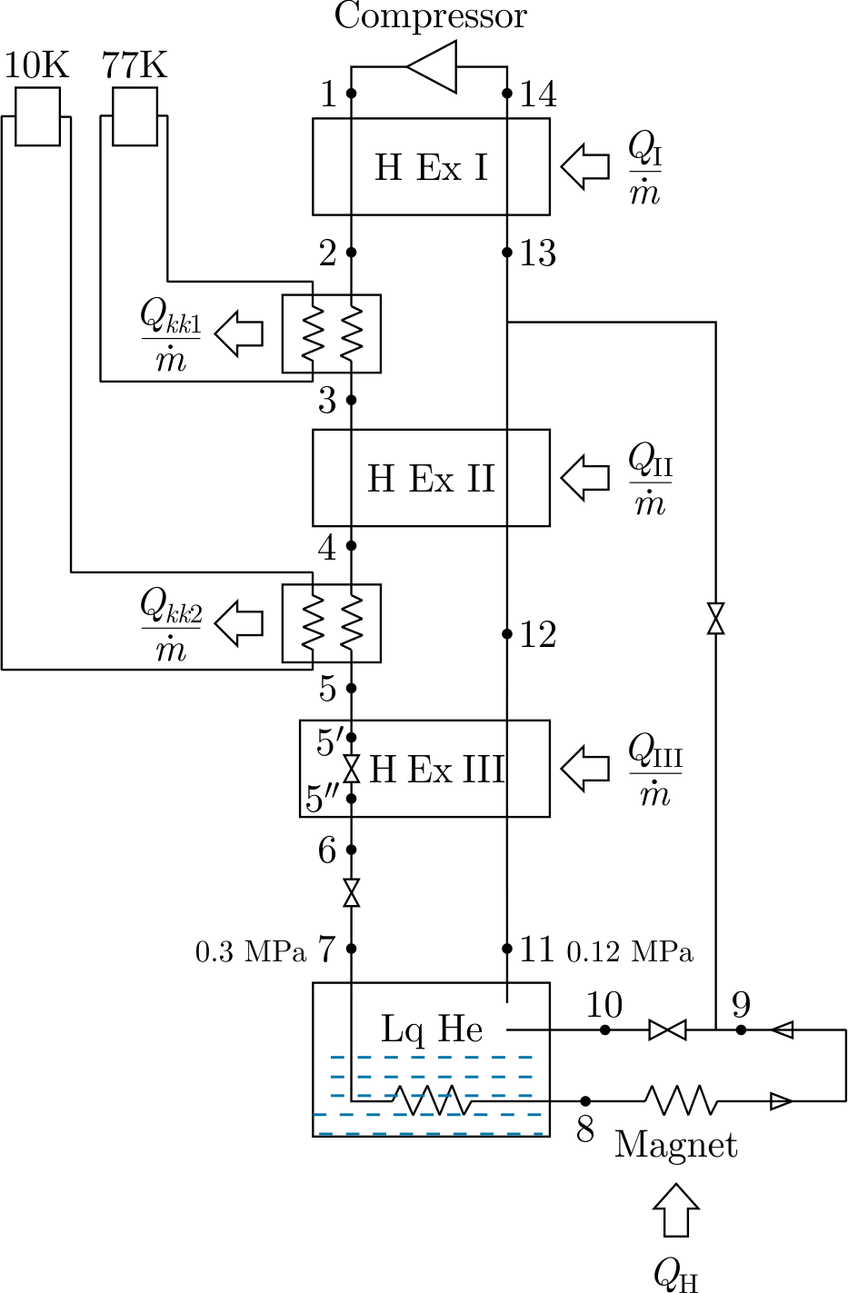The first stage of preliminary cooling of the refrigerator is provided by the first stages of two OPERATION 2 cryocoolers with a capacity of 45 W at 77 K each. They also cool the thermal screen of the refrigerator cryostat. The second stage of preliminary cooling of the refrigerator is provided by the second stages of the same two OPERATION 2 cryocoolers with a capacity of 14 W at 10 K each. The final stage of cooling operates according to the throttling principle. A regulating valve is installed at the outlet of helium from the cooling channels of the solenoid. The valve is designed to adjust the helium pressure in the magnet winding. The heat flux coming from the current leads is removed by an OPERATION 8 cryocooler with a capacity of 67 W at 40 K. The heat flux coming from the winding thermal screen is removed by four TC4188 cryocoolers with a capacity of 15 W at 77 K each, evenly installed on the cryostat cover. As a backup cooling system for the solenoid thermal screen, natural circulation of liquid nitrogen with vapor recondensation in a TC4862 cryocooler is anticipated.