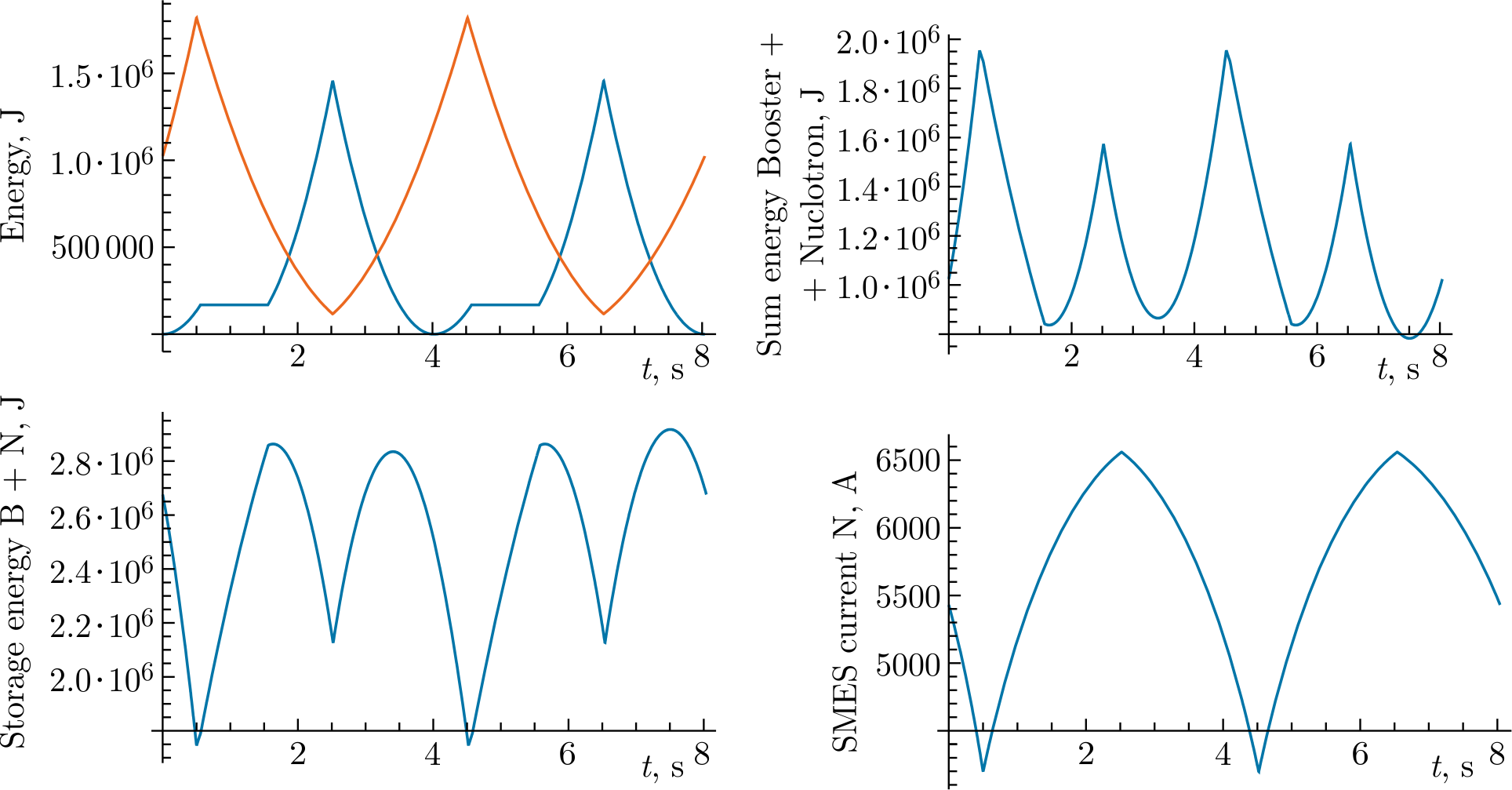 Figure 13. Dependences on time for currents and energies for Booster, Nuclotron and SMES magnets; top left figure: red line — Nuclotron current, blue line — Booster current.