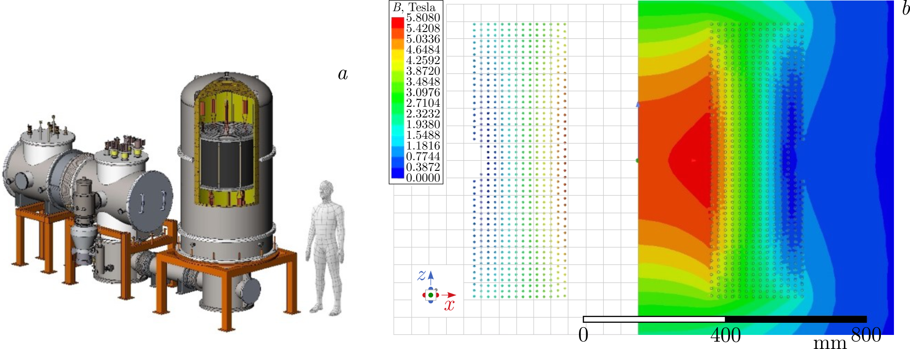A solenoid (inside a cryostat) for SMES of the NICA power supply is presented in Figure 14a, and its magnetic field distribution is shown in Figure 14b. The maximum stored energy at current of 6.7 kA is 3 MJ. The maximum magnetic field at the winding is almost 6 T. The magnet may be pulsed with the shortest period of 2 s and the maximum reactive power of about 1 MW. Such fast magnetic field ramp requires the magnet to be made of HTS. That significantly reduces the power required for cooling and, in the case of realistic cooling power, results in better operational stability. Operating temperature of SMES is 30 K due to planned liquid neon cooling.