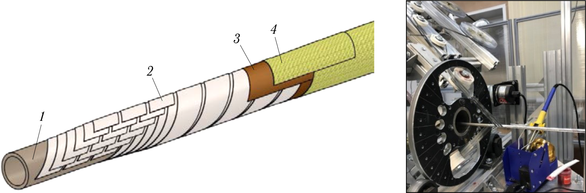 Figure 15. SMES cable structure and photo of cabling process (1 — Cu–Ni alloy tube 8 mm O.D., 6 mm I.D., 2 — HTS tapes 4 mm “high field”, 3 — brass tapes, 4 — prepreg tapes).