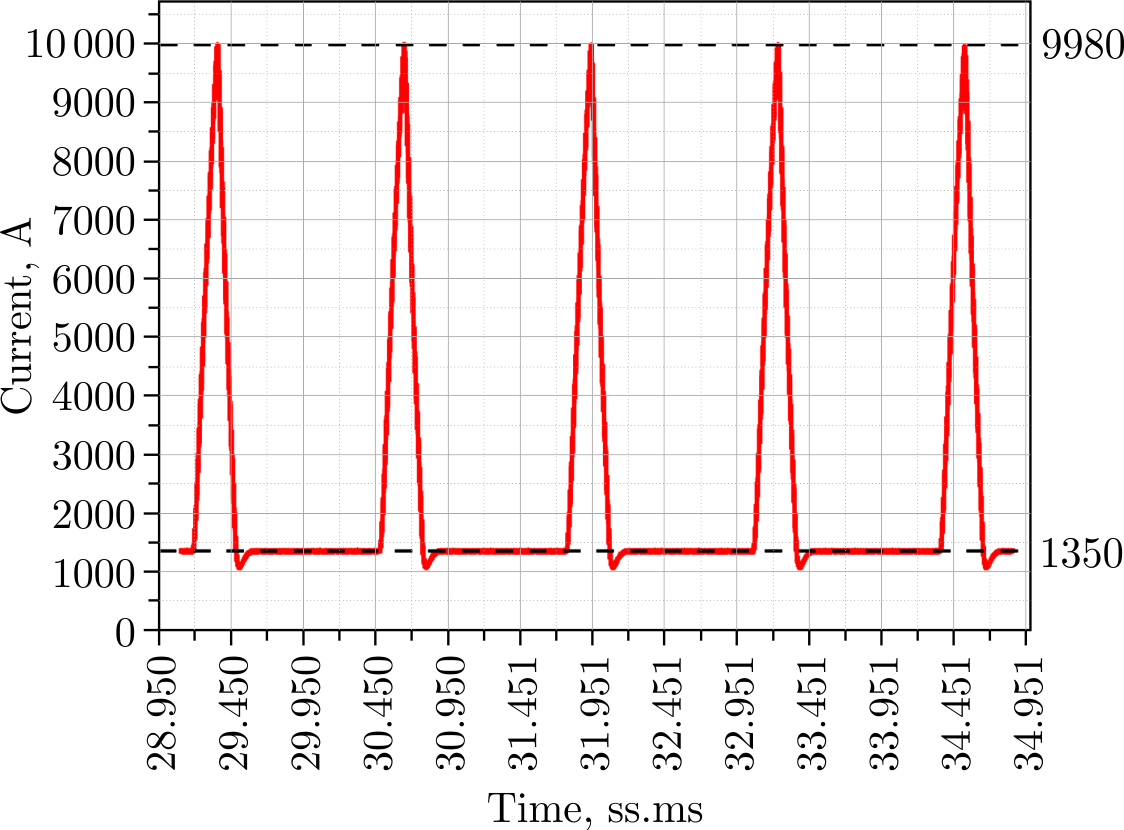 | \(I = 11\,754\ \mathrm{A}\) | \(I = 5\,877\ \mathrm{A}\) | |||