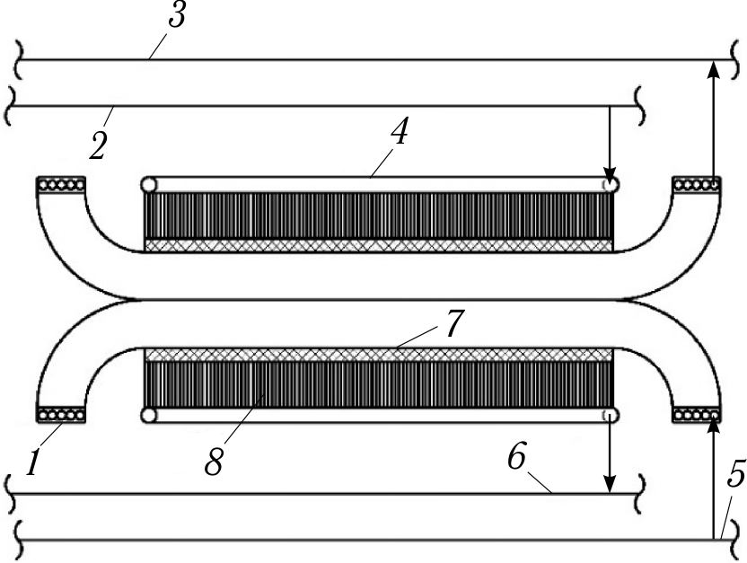 Figure 25. Schematic diagram of a magnet with combined cooling by flows of gaseous helium and boiling nitrogen: 1 — superconducting winding; 2 — supply collector with liquid nitrogen; 3 — outlet collector with gaseous helium; 4 — yoke cooling tube; 5 — supply collector with gaseous helium; 6 — outlet collector with nitrogen; 7 — thermal insulation of the winding from the yoke; 8 — iron yoke of the magnet.